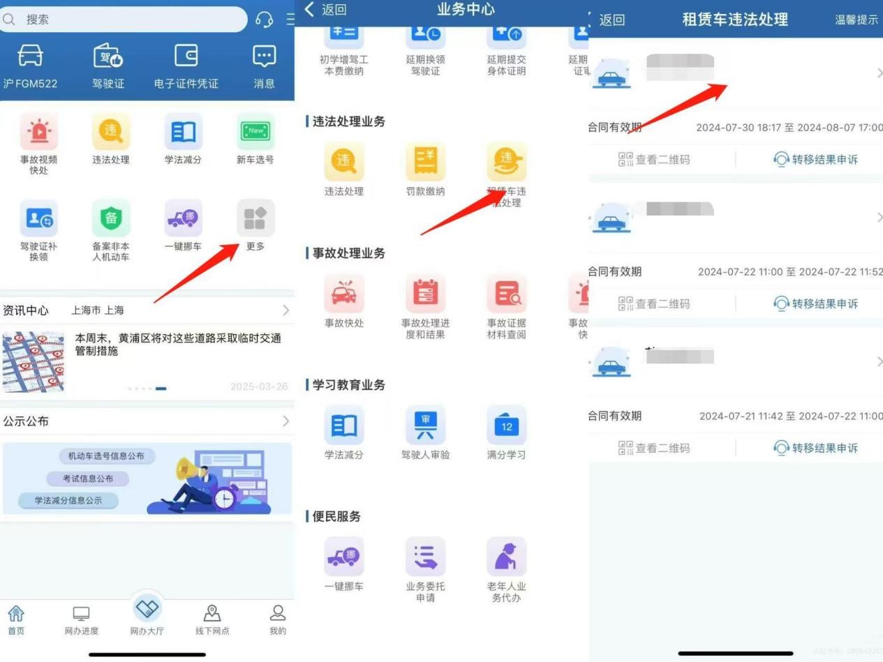 完成“交管12123”APP个人认证后,点击菜单栏“更多”按键,下拉、或者搜索到“租赁车违法处理”功能,手机端完成违章处理。