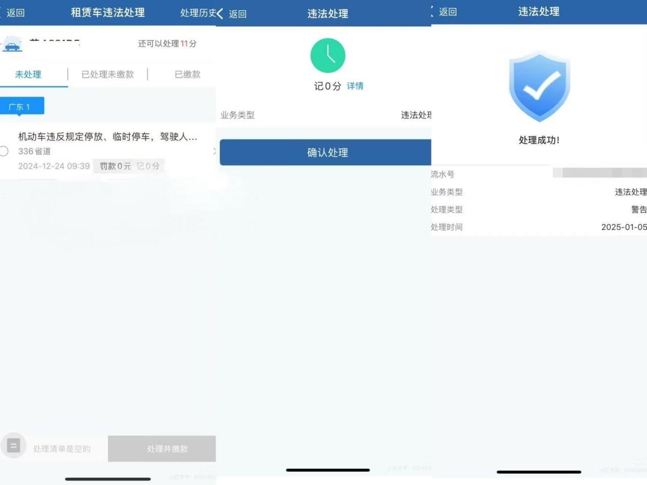 (1)如无法线上处理,需要线下处理,根据交警部门要求,需携带本人驾驶证原件、身份证原件、租车合同、委托书,车辆行驶证原件或电子行驶证件,到违章当地或车牌所在地的交警部门办理;具体所需资料和违章处理相关规定各地存在差异,请事先咨询当地交警部门。